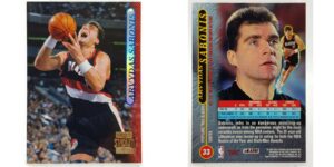 Judame toliau, prie Lietuvos legendos – Arvydo Sabonio. A.Sabonio pirmoji NBA kolekcinė kortelė yra iš 1995–96 sezono — tiksliau, 1995–96 Topps Stadium Club serijos leidimas su jo atvaizdu Portlando „Trail Blazers“ aprangoje.