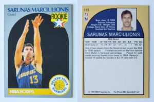 Pradėkime nuo pirmojo lietuvio, pravėrusio NBA duris – Šarūno Marčiulionio. 1990–91 NBA Hoops #115 – tai viena iš pirmųjų Marčiulionio NBA „rookie“ kortelių, kur jis vaizduojamas žaidžiant Golden State Warriors komandoje. Nors Marčiulionis NBA žaidė nuo sezono 1989–90, būtent 1990–91 „Hoops” rinkinys laikomas jo pirmuoju platesnio masto NBA kortelių leidimu.
